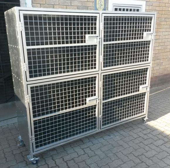 This variation is a four- unit veterinary cage. The unit is composed of four equally sized cages (100cm(L) x 85cm (H)) with dividers. Slider dividers can be removed to enlarge the top two cages to one larger cage and the two bottom cages to a larger cage. The cage’s sturdy construction ensures that your pet stays safe and secure while in the vet’s care.