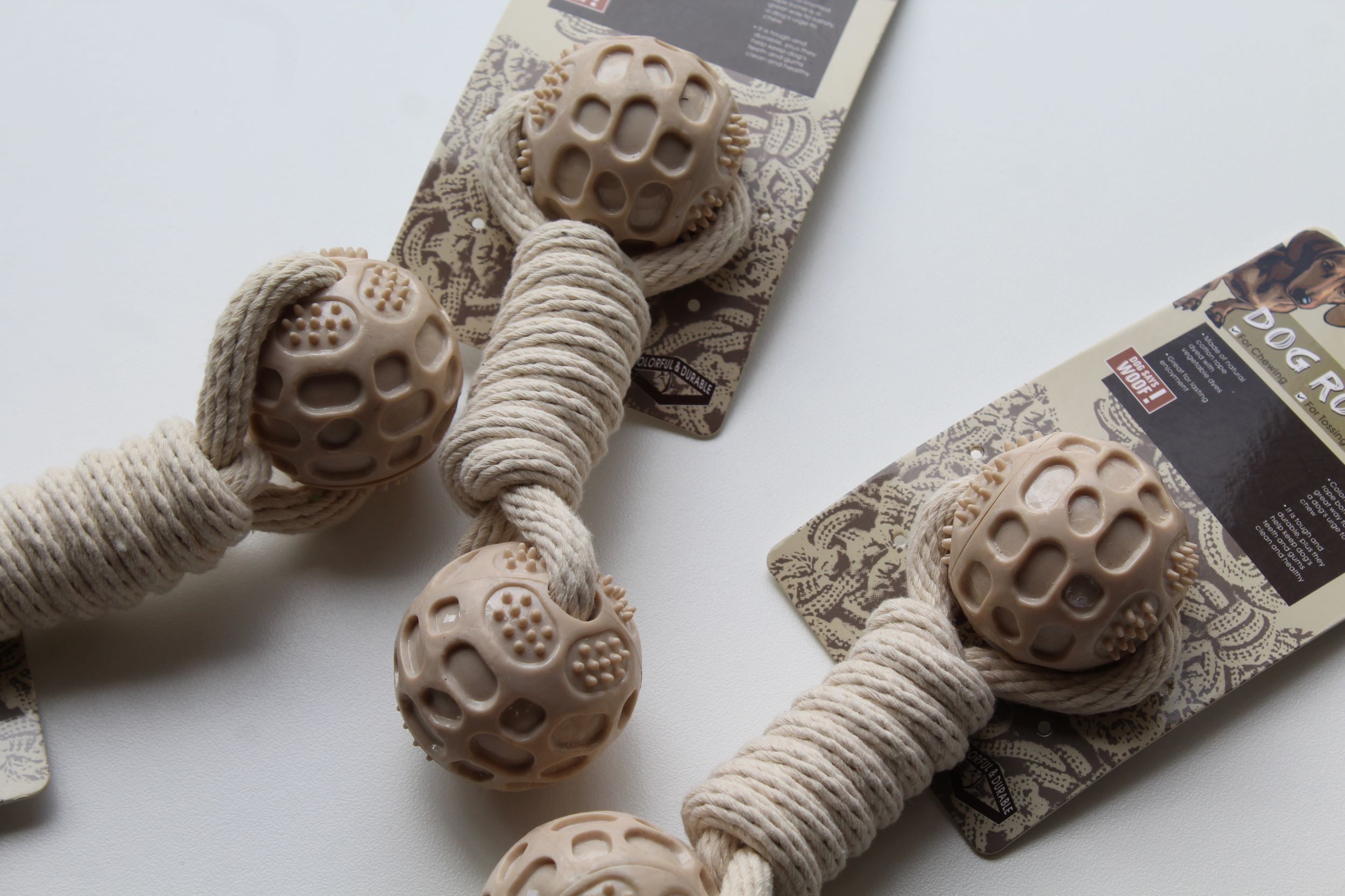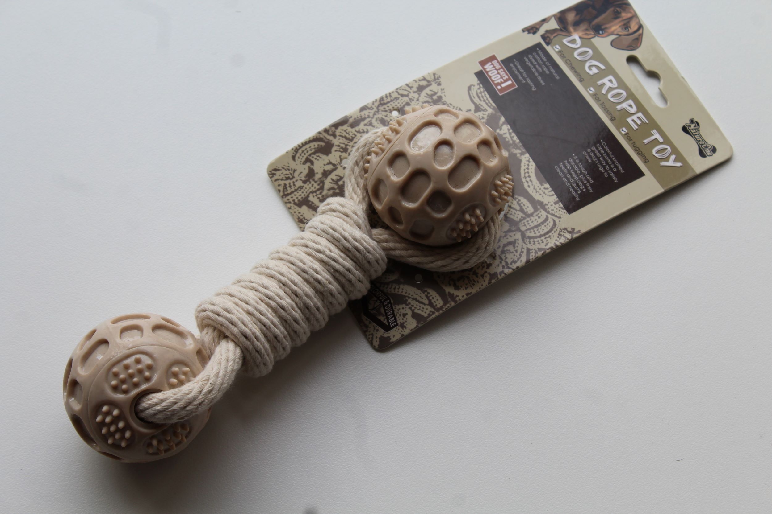 The Nature One Rope Dumbbell Toy has two rubber balls attached and is a versatile toy that offers the delightful combination of entertainment and dental health benefits. Crafted from durable and long-lasting materials, this toy is designed to withstand vigorous chewing and play, ensuring hours of safe and enjoyable fun for your furry friend.