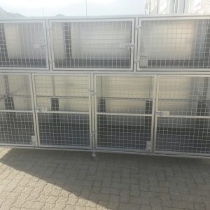 This variation is a six-unit veterinary cage. The unit has three cages on top and three cages at the bottom with dividers. Slider dividers can be removed to enlarge the bottom cages to one larger cage.  The cage’s sturdy construction ensures that your pet stays safe and secure while in the vet’s care.